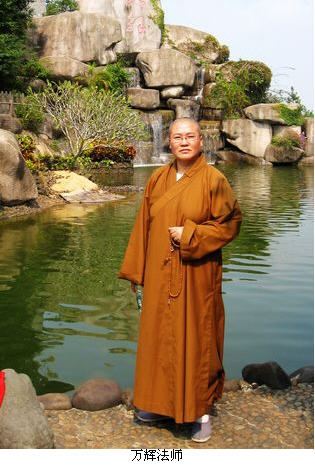万辉法师,1962年出生于辽宁省铁岭市。法师自幼喜爱绘画艺术,1985年毕业于辽宁省沈阳市鲁迅美术学院。毕业后,万辉法师在铁岭市红旗剧场做美工,负责电影的宣传绘画工作。1993年,万辉法师成立了自己的绘画工作室,做广告策划,美术绘画等。2007年,因缘殊胜,万辉法师拜辽宁省铁岭市盘龙山圣水寺方丈上中下言法师为师,剃度出家。同年,受铁岭市宗教局礼请,万辉法师担任铁岭市腰堡镇双龙山圣水寺住持,负责管理寺务。2009年,万辉法师开始接触藏传佛教,依格鲁派宗咯巴大师的法脉传承,主修菩提道次第,宣讲三主要道,修习密法,尽得夏巴活佛的真传。万辉法师显密双修,但以修密宗为主。法师勤研戒律,苦修佛法,又擅长绘画,是一位难得的才艺双全的住持高僧。