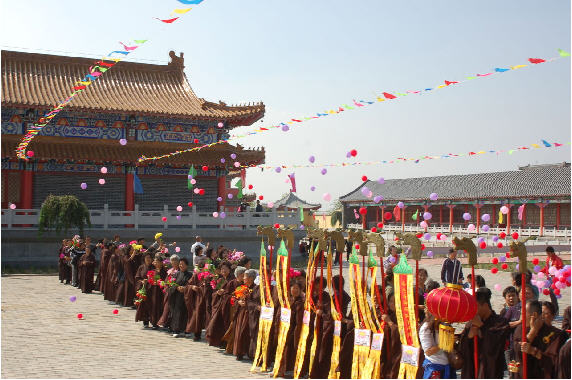 各殿供奉的儒家、道教、佛教至圣先师、天尊祖师、世尊佛祖等栩栩如生的玉石雕像和菩萨及诸神彩塑造像共57尊。佛圣殿内供奉“横三世”佛:主尊为释迦牟尼佛,胁待为老“伽叶”、少“阿难”两大弟子及文殊、普贤二菩萨;左侧为药师佛,胁侍为日光、月光二菩萨,合称“东方三圣”,亦称为“药师三尊”;右侧为阿弥陀佛,胁侍为观音、大势至二菩萨,合称“西方三圣”,亦称为“弥陀三尊”。道圣殿内供奉道教教祖老子及两位童子和王灵官、赵公明两位道教护法神。儒圣殿内主尊奉祀大成至圣先师孔子,“四配”为颜子、曾子、子思及孟子。大殿东侧配殿观音殿内奉祀观音菩萨及胁侍善财童子和龙女;西侧配殿地藏殿内奉祀地藏菩萨及胁侍闵公和道明父子。三座大殿及观音殿、地藏殿和山门(天王殿)内供奉的29尊玉石雕像请自于岫玉之都岫岩,每尊造像皆为重逾十余吨的整块玉石雕成。雕塑匠师以圆雕、凸雕、镂雕、线刻等多种手法交替使用,穷工极巧,以求尽善,先后历时近三载,一锤一钻精雕细琢,造像可谓色彩晶莹,玲珑剔透,工艺精湛。佛及菩萨面相广额丰颐,弯眉秀目,隆鼻薄唇;老子、孔子及“四配”面相丰腴,神态静穆,风度典雅。所有玉石造像比例匀称,体面转折柔和舒展,肌肤润泽,形神兼备,活力内蕴。一座寺院29尊主尊及菩萨胁侍造像皆为名品玉石雕成,不仅辽宁乃至东北绝无仅有,也为国内所罕见,堪称全国岫玉雕刻之最。让现代人所观赏崇拜,一饱眼福自不必说,也为后世留下一份珍贵的艺术瑰宝。佛圣殿内两侧供奉的十八罗汉,山门(天王殿)内分列两旁的四大天王,东西配殿供奉的关帝、财神、吕祖、岳王、文昌、娘娘等造像共28尊,均为玻璃钢塑成。色彩艳丽,塑工考究。所表现的人物肌体健壮,神情严肃,于镇定自若中更添威武的气势,内在精神表现的十分真切。无论是玉石雕像还是玻璃钢塑像,由于均选用上等材质精雕细塑,准确而生动地显示了造像本身所代表的神灵的活灵活现,超然入化。加之五彩缤纷的“庄严”和简洁明净的“供具”,将各殿堂装扮打点得既华丽悦目又肃穆庄重。