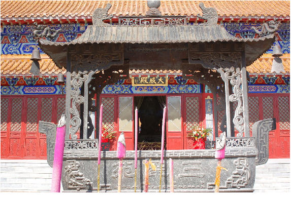 走近三圣寺,但见三圣寺占地近2万平方米,建筑面积近5000平方米。俯视整个寺内,布局为三进院落,四重殿堂。中轴线上由南及北依次为山门(与天王殿合一)、儒圣殿、道圣殿和佛圣殿,且自前至后逐级升高。大殿东西两侧为配殿。山门内左右两侧分别为钟楼、鼓楼,稍后为莲池。莲池北亦即佛圣殿东西两侧各一座碑亭对称而立。儒、道、佛三重大殿分别建筑在三座石砌台基之上。台基层叠宽舒。与高大壮观的殿顶相称。周围附有石制望柱,柱间各嵌石板为栏相连环绕。殿前设有宽大的石阶,石阶中间花冈岩铺就的垂带上,雕刻云龙图案。台基四周及石阶两侧的望柱头上,雕刻莲座及莲花图案,石栏板上浮雕龙凤、松鹤、跑鹿,梅荷等纹饰图案,姿态优美生动,使三座大殿仿佛掩映在小石林间,颇为壮观。三座大殿均采用传统的重檐九脊歇山顶,飞檐斗拱,顶覆黄色琉璃瓦。正脊上鸱吻高耸,岔脊末端的仙人、吻兽排列齐整,为大殿增添了神话色彩。大殿东西两侧的配殿分别设有观音殿、地藏殿、关帝殿、财神殿、吕祖殿、岳王殿、文昌殿、娘娘殿和法堂、茶堂等,为青砖青瓦卷棚式屋顶。殿前游廊间分别列置21根大红檐柱。柱间亦由精美浮雕石栏板和莲座望柱头的望柱连接。山门,为单檐歇山顶,上覆黄色琉璃瓦绿剪边,辟为三座拱门。因与天王殿合一,建筑亦为殿堂式。殿内奉祀弥勒佛、韦驮菩萨,东西两侧分列四大天王。山门外一对座狮分列左右,威镇四方。山门内的钟鼓楼成左钟右鼓排列,为两层方楼。上层四角屋顶飞檐攒尖,面亦覆黄色琉璃瓦绿剪边,尖顶置黄色琉璃宝顶。四周成回廊,外檐饰有斗拱。钟鼓二楼北侧,即大殿两侧与东西配殿之间,各一广为700余平方米的石栏围绕的莲池点缀其间。寺内整体建筑融古代名寺、名殿建筑风格于一体,虽为现代化的建筑规模,但在建筑手法上,仍保留了古代木构建筑的一些手法,再现了盛唐时期以及明清两代的建筑设计风格,既有北方的粗犷,又有南方的细腻幽雅,既有独特的建筑造型,又有奇巧的斗拱飞檐,外形古朴,柱梁简洁,举架高昂,气势恢弘,争写天上之姿,竞模山中之影。