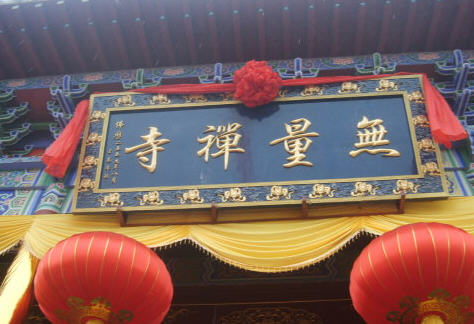 未进(山)门,昂望正殿门口上方悬掛一块长方型金匾:横写着金光闪闪的“無量禪寺”四个楷体贴金大字: