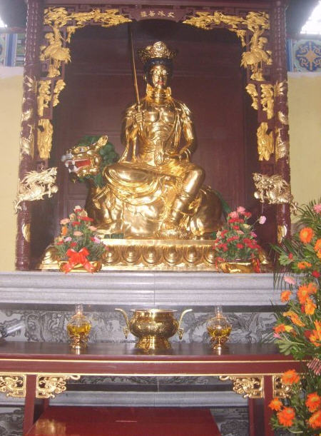 文殊菩萨,音译文殊师利或曼殊师利。意译:妙德,妙吉祥。又译:妙首,普首,濡首,敬首。曼殊是妙之意,师利是吉祥之意,简称为文殊。为中国佛教四大菩萨(文殊菩萨、普贤菩萨、观音菩萨、地藏菩萨)之一。文殊菩萨和普贤菩萨为释迦牟尼佛的左、右胁侍,他们合称为“华严三圣”。文殊菩萨智慧、辩才第一,为众菩萨之首,被称为“大智文殊菩萨”。