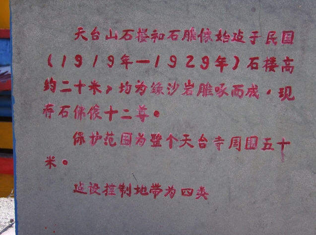 现在我们看到的天台寺有“弥勒菩萨殿”、“准提佛母殿”。其中“全石楼”为该寺的代表建筑。该石楼可以拾级而上。登上顶层,放眼远方,天地相接,有种脱离世俗的感觉。如今的天台寺已是车水马龙,众信你来我往,香火十分旺盛。