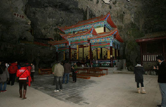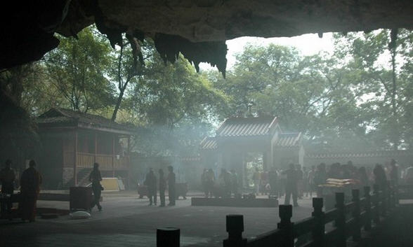 水源寺依溶洞内壁一面而建,泗水河从另一面轻轻淌过,淙淙的水音伴着阵阵诵经声,更增添了一份和谐。据介绍,水源洞古称灵岩或灵洞,公元三世纪,建“问心”庙。洞内大厅宽38米、高20.8米,洞门最高处山崖绝壁上,刻有乾隆时期左江观察使王玉德所题“第一洞天”四个苍劲有力的大字。
