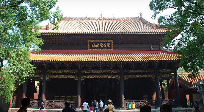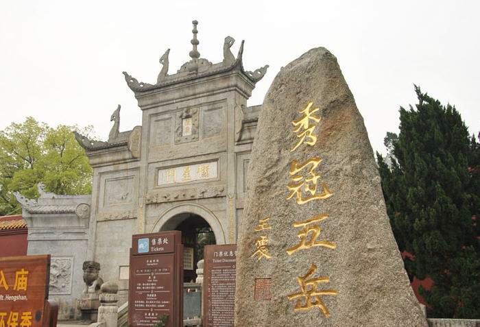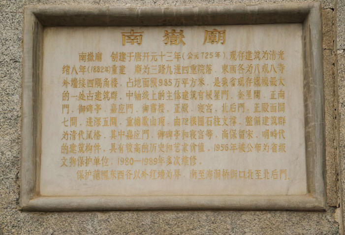 南岳庙位于湖南省衡阳市南岳区群山之中,俗称“南岳大庙”,“新圣帝殿”,是一组集民间祠庙、佛教寺院、道教宫观三位一体的古建筑群。它是湖南省重点文物保护单位。大庙位于南岳镇北端,前临寿涧水(古为护龙池),后枕层绝峦叠嶂、烟树云海的赤帝峰。该峰据《淮南子》记载,乃赤帝祝融死后墓葬之处。原占地面积九万八千五百平方米,现有面积七万六千八百平方米,建筑面积二万五千八百平方米。中轴线主体建筑分为九进、四重院落。两翼东有八观,四列八寺,形成佛、道共存于大庙的格局,这种格局是南岳大庙有别于其它四座岳庙的重要特色。前后纵深375米。从前至后,依次为棂星门、奎星阁、正南门、御碑亭、嘉应门、御书楼、正殿、寝宫、北后门。层次分明,疏密有致。四个院落,大小不一,古木参天,花草缀地,绿叶摇翠,飞鸟鸣轩。碑、亭、水池之属,总是两相对称,石径通连,掩映错落,点缀繁花浓荫之中,成为宫殿建筑与园林建筑高度结合的艺术群体。