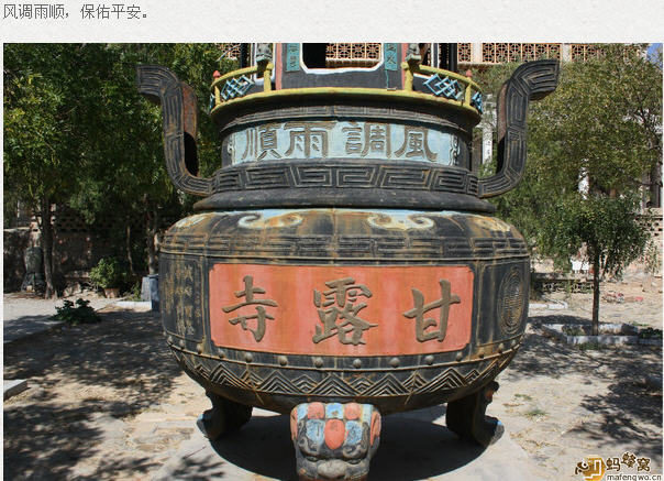 宋仁宗年间(1049-1091年),异军犯境,大将狄青奉命西徵,驻军于临河,与异军对峙,隔河相望。两军对阵,互有胜负。当时,宋军粮草由内地运来,因路途遥远,供给不极时,若战事旷日持久,势必难支。狄青意在速快,苦无良策,由是烦闷。一日悃眠,梦中见一神人曰:“汝与异军对敌,只可智取不可力抵,否则难以取胜。”青于梦中惊醒,沉思良久,忽然省悟。次日狄青令将马鞍收集起来,依山势堆放,上覆草席。又令将马粪集中,于同一时间倾入黄河,顿时河面飘满马粪,厚达尺余,对岸及下游异军见了相谓曰;“天朝兵多,光马鞍堆满了一架山,河里飘的马粪有一尺多厚,看来我们难以取胜了。”一时异军军心浮动。狄青又派懂突厥、蒙古等语的兵士潜入敌营散布流言。异军首将闻之,犹豫不决,有意退兵。狄青又出兵讨战,双方阵前理论,狄青向异军晓以大义,喻以爱民之理,双方罢兵言和。狄青因神人指点获得胜利,为酬报神人点化之恩,即在驻这之处择原尼姑庵扩建寺宇,取名“甘露”。“冯鞍山”亦因宋兵当年堆入马鞍而得名。至今山内犹有插旗石、马蹄沟等遗迹留存。