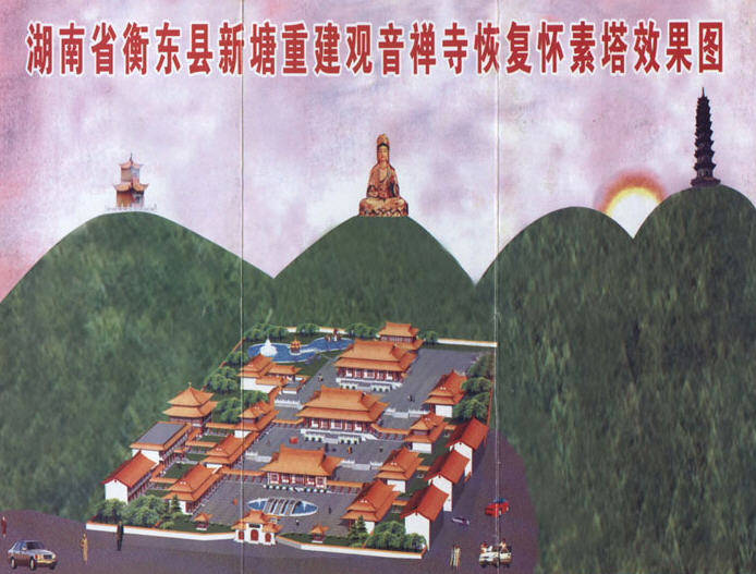 南岳衡山七十二峰之一的晓霞峰,在今衡东县新塘镇和新塘经济开发区内,与衡山县城隔湘江而相望。镇域内人文景观较多。从衡山县城看晓霞峰,巧似两只昂首对峙的大雄狮在戏耍,故称“二狮滚球。”这里亦是“衡山八景”之一的“晓霞晴岚”。清代御史王大经曾赋诗赞曰:“轻烟缥缈弄朝光,狮子岩前浴影凉,风动翠微深似絮,却迷湘岸一峰苍。”在晓霞峰“狮子岩”下曾建有“海月寺”,是明万历中叶(约1596年)慈圣太后敕建。寺内供有铜佛、观音、韦驼、十八罗汉,还有古钟一口。鼎盛时住僧侣100多人。惜乎该寺于1958年拆毁。在晓霞峰下南端有座“二童攻书山”,即是唐玄 三藏法师门人、千卷佛经之译者、草书大家唐人怀素窣堵坡(舍利塔)故址,距今有1220多年历史。从衡山县政府门口隔江相望,这里“有三峰,中峰稍低而平,似书案,左右两峰并峙,如二童向案而立。”故名二童攻书山。乾隆五十二年的衡山知县徐绵,为了崇尚文化和培植风水,倡众在“二童攻书山”的中峰建一“崇文”塔(又名文峰塔),在清理地基时,发现有旧基痕迹埋于深处,经考证是唐怀素 堵坡故址。建成的文峰塔身七级,高24米,基础直径7米,砖石结构,共223级石阶,旋而上至顶。登塔极目曰:“七十二峰罗布森列,湘潭一带舟楫往来,沙鸟翔集,城中庐舍参差,皆在指顾之下。”惜乎该塔于1967年被毁。然佛教寺塔历经苍桑,晓霞峰坡坡凹凹,山青水秀,乃是建寺兴佛的风水宝地。现经省、市、县宗教主管部门正式批准,拟在“二童攻书山”中峰恢复怀素塔,在“二童攻书山”右下窝重建观音禅寺,塔寺相映。这是一件顺乎民意,符合法律规范的善举,是一个流芳百世、功德千秋的项目,是一处高品位的佛教文化人文景观。