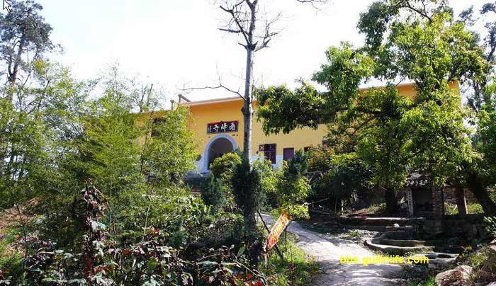 南峰寺古称狮形寨,坐落在阳朔县金宝乡狮形山顶峰,占地30亩,四处山清水秀、古木参天,寺内如来、观音、十八罗汉塑像栩栩如生,各种法器一应俱全。据寺内老僧人介绍,此处在盛唐时期即有庙址,后历经千年沧桑,于清朝道光二十四年(公元1844年)正式建寺,民国初期有名僧文轩大师到该寺讲经,证实此山为佛教圣地,命名为南峰寺。