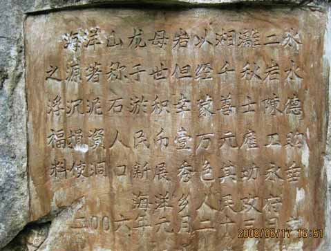 海洋山又名海阳山、阳海山、阳朔山、龙母山。位于海洋圩东北0.5公里,距桂林45公里。海拔1017米,山体周长300米。民国十七年凿石为梯,可登山顶。《寰宇记》载:“山形如覆釜,有岩极幽邃,秉烛入,行数百步,至泉水处,洞不盈尺,其深莫测。”山下龙母洞,高宽不足4米,有细流溢出。洞壁有宋摩崖壁刻“湘漓二水之源”。另有马子岩《祷雨记》、陈邕《海阳山灵泽庙之记》等四处,以及清代,民国和现代壁刻共8处。有海龙庵“在峰南石崖之半”,为当年徐霞客游览考察海洋山下榻处,今存遗址。