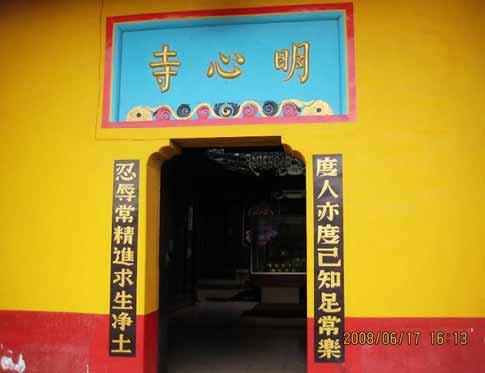 明心寺位于海洋山西麓,占地面积1500平方米,今建筑面积700平方米。古有海洋庙,祀湘漓二水神,唐、李商隐《祭水源神文》:“惟神虽灵,南服实号北源。湘浦降神,近惊于骚客;彪池侵稻,远叶于诗人”“……”。宋乾道九年(1174)广西经略使范成大请敕封灵泽候,孝宗帝御赐灵泽庙额,清雍正九年(1732),广西巡抚金铨奉旨修陡河并请重修灵泽庙,十年二月落成,久圯。后经修葺,名明心寺。“文革”中遭破坏。1992年留寺神职人员主持集资修葺并举行佛像开光大会。