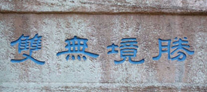南下百米,有三尊巨石并立,中有一石向内倾斜,上倚下空,嘎然洞天,门扉天成。古人以佛家“不二法门”之意,命名“不二门”。迎门对联为:“半窗阴雾藏高木,一片晴山衬夕晖”。入“不二门”,有一峡谷,石壁笔陡,直抵蓝天,即是湘西自治州境内唯一的摩崖石刻。