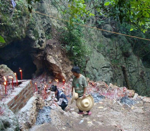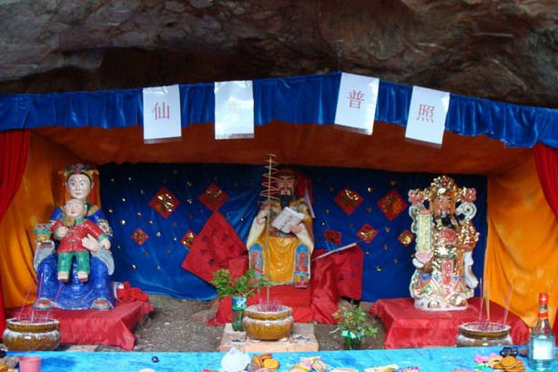 洛西福灵寺座落于马山半中腰的岩洞里,石壁的文字记载的是建于光绪六年。今年初洛西热心人士苏瑞文、韦曼云发动群众捐资重建,大家自己动手修路,安置神佛造像,用了四个月时间完成第一期工程。