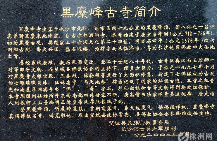 1993年8月,县委统战部、市宗教局、县佛教协会和当地乡、村,在黑糜峰乡政府召开联席会议,决定向县人民政府报告,按照党的宗教政策,恢复黑麋古寺。1994年,县政府发文(望政发[1994]10号),同意恢复黑麋古寺。1995年3月,由县政府周壮德、县政协李锦桃同志主持召开专题办公会议,形成了望政纪(1995)6号纪要,明确了庙产四至以山门为界,东西南北四井属寺庙范围。县佛教协会,经多年努力,于1997年修复竣工,由县佛协会长、得高望重的释大镜法师亲任住持。黑糜峰寺已成为长沙黑麋峰森林公园的主要景点,为促进我县旅游的发展作出了贡献。”