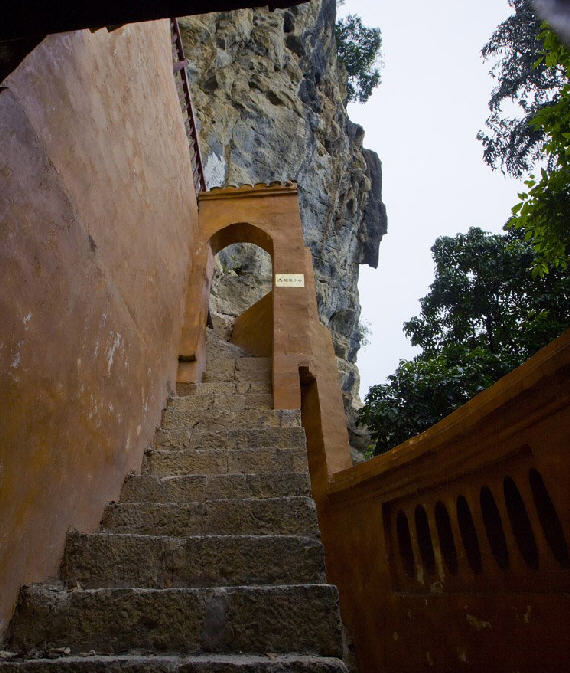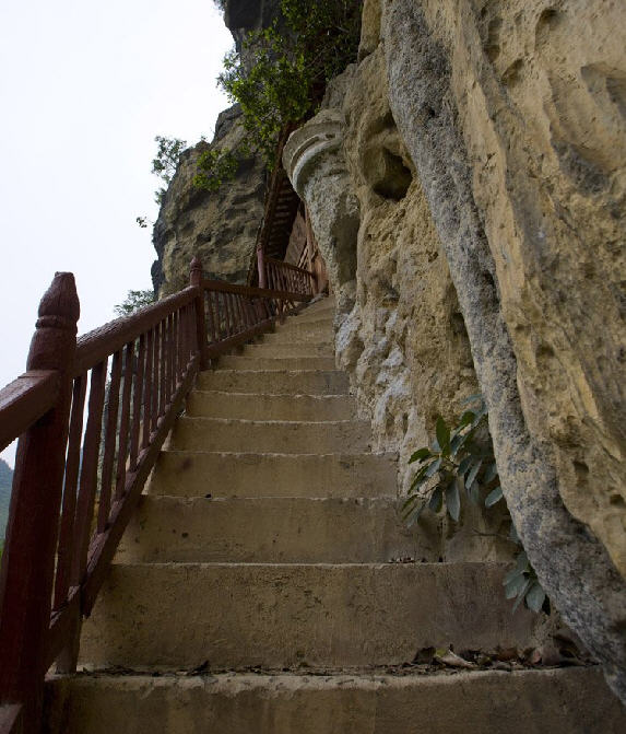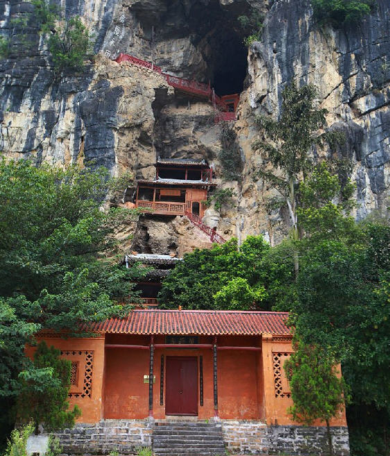 三层是一大洞口,穿山而过。洞前石壁上架一天桥,用枧木构成。虽经300多年之久,仍固若金汤。登桥远眺,向都山城尽收眼底;移眼脚下,如置身于云端,不禁心惊肉跳,胆小者均不敢上。天桥旁的悬崖上刻有“南疆永固”4个大字,立于山前公路上远远望去,赫然入目。洞内地面上置有石桌石凳,古色古香,供游人休息玩乐。石桌旁有天然石狮、石龟,伴着游人嬉戏。洞顶乳石倒挂,犹如盏盏天灯,为游人照明。后洞口石壁上刻有“风洞”二字。站在此后洞口,清风拂面,凉爽清幽,犹仙境也。放眼遥望,山后小河蜿蜒,数座小山包立于河边。前人形容为“五马沿江走,三星水上浮”,蔚为壮观。风洞旁有两个小洞,一洞通后山脚,一洞通后山顶。小洞内石上有一脚印,相传为宋朝侬智高的四弟侬智会留下的脚印。