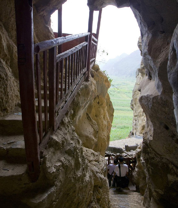 下洞即在琅山西麓,其门西向,东入三丈余而止。仰其上,则悬岩层穴,又连叠门两重。余初至此,望之不能上达。明日又至,亦不知其上层之中通于东,并不知东之可登也。既而闻黄君命缚梯,既而由其南峡,同韦守老往百感出山之东,回望见梯已蜿蜒垂空,始知上洞须东上,下洞独西入,而中洞则无由陟焉。