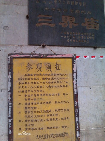 金田三界庙始建于清顺治18年(1661 年)、座北朝南,主体建筑四合院式布局,分为前座、天井、后座和庑廊,建筑面积302平方米。金田三界庙建筑艺术繁缛优美,脊饰为佛山石湾陶瓷人物故事装饰,保留了清中晚期岭南地区建筑艺术遗风。庙内有清康熙道光年间的官府告示、规条等。碑刻23块,是研究当时社会的宝贵资料。庙内还陈列了金田村起义历史的文物资料。三界庙内,现有《重修宣里新圩三界庙碑记》、《安良约碑记》等碑刻20多方,碑文反映了金田起义前夕当地的社会、经济和阶级状况,是研究太平天国历史的重要资料。三界庙亦已被列为广西重点文物保护单位之一。