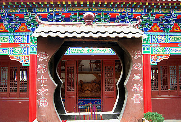 巍巍雷峰钦山下,青龙白虎间,苍翠的木鱼山脚,一片片殿宇亭阁鳞次栉比,古朴古香的建筑群,错落有致的随山势逐级抬升,自东向西次第铺展,寺院内外浓绿片片,几处池沼波光粼粼,一片清澈溪流潺潺穿行,不时飘来几缕悠扬悦耳的馨声,经声佛号回荡碧空,好个悠远、深邃、闲适,真乃是参禅悟道修身养性的所在。