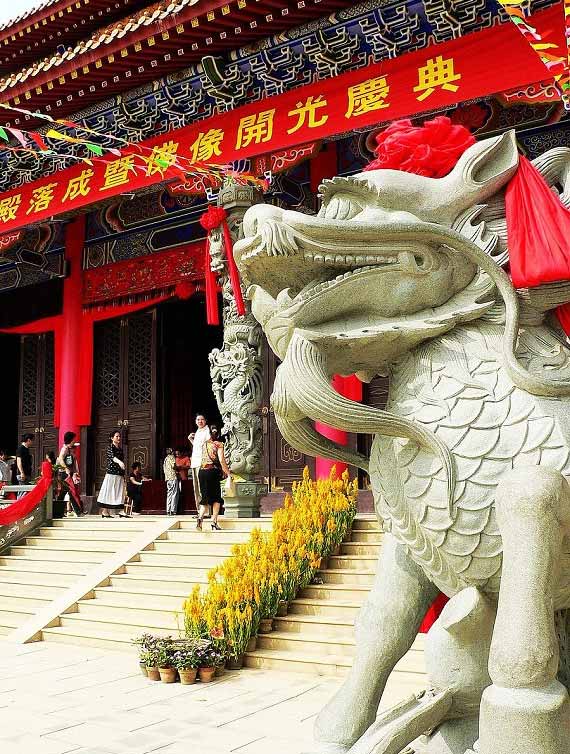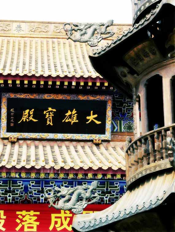 大雄宝殿广场面积3000多平方米。大雄宝殿前广场左为钟楼,右为鼓楼,钟鼓楼各占地面积50平方米,为两层明清风格建筑。钟楼的铜钟为浙江温州制造,重6.6吨、高3.6米,轻轻一敲,声音悦耳,回音长达两、三分钟,大钟的表面雕有《金刚经》经文。将经文刻在大钟上,意思就是要弘扬佛法,让佛经传诸久远。击钟一下,字字皆声,等于诵读一遍经文,功德无量。钟楼的壁画画的是西游记的故事。鼓楼上的大鼓为浙江温州的水牛皮制成,直径 2米多,用四个木雕狮子做鼓架。大雄宝殿正面走廊有两根腾云驾雾的龙柱,龙柱正面两条龙的龙头向外,表示接引信众、天下客人;龙柱内侧两条龙的龙头向内,表示守护大殿、佛祖。后面有一条小龙,精神抖擞,龙柱的人情味十足。