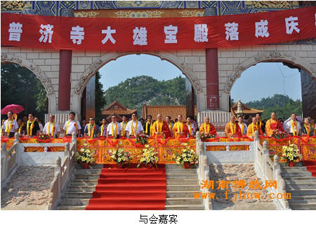 在落成庆典上,湖南省宗教事务局处长唐子建等省、市、县有关部门领导做重要讲话,湖南省佛教协会会长会长圣辉法师作开示,希望在住持智净法师的带领下,继续弘扬爱国爱教的优良传统,继承佛教“慈悲济世、普渡众生”的精神,把普济寺建成一个弘法的圣地,自觉地为构建和谐社会,为嘉禾的经济社会发展作出应有的贡献。
