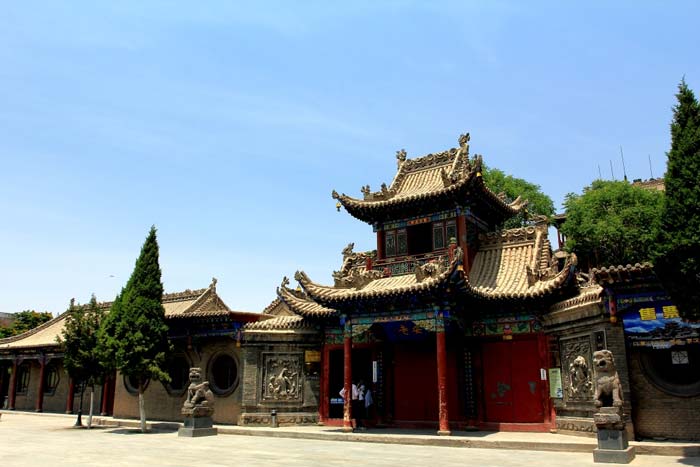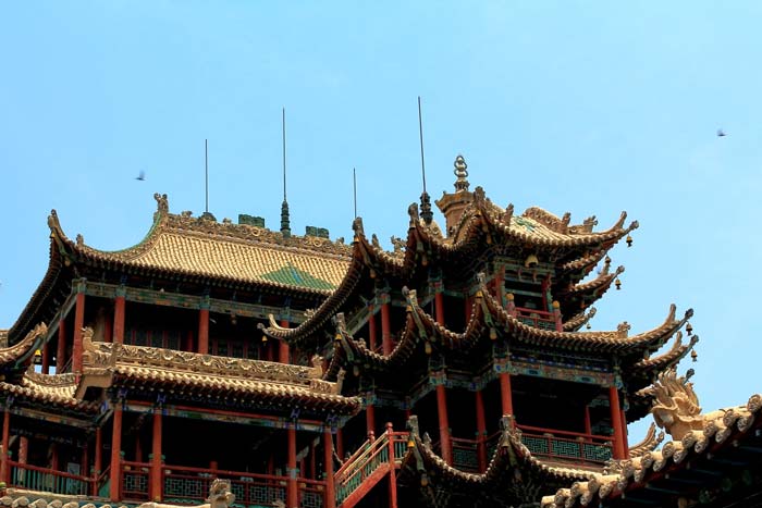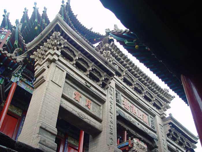 通天王殿,登十二级台阶,下有东西贯通的弧形隧道,叫地狱宫,清咸丰八年增建的三孔砖牌坊,巍然屹立在隧道之上。设计别具匠心,砖雕工艺精美,内容丰富多彩。再十二级台阶,通过“华藏玄门”,绕过屏障,迎面是重叠三层的主楼,一层为“大雄宝殿”,二层为“西方三圣殿”,三层为“五方佛殿”。主楼高二十九米,为九转七工程,大层顶腾空拔起,气势宏伟。主楼前建有三层玲珑俊秀的“大悲阁”(俗称中楼),其造型之奇特,雕刻艺术之精美为全寺这精华。其底层为透风过厅,四通殿宇,排列有序的翘首飞檐三层共有三十六个。在三楼脊顶中起一座八角塔,犹如凤冠;在大悲阁东两侧又建双层楼阁(即钟鼓楼)如凤凰之两翼。从整体看,整个建筑似凤凰殿翅,给人以空欲飞的感觉。