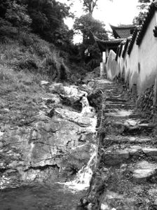 山助水之气势,水添山之灵性。不必踏进寺门,在很远的地方就可以听灞涌岩上传来的潺潺水声。溪水在灞涌岩的右侧,自上而下顺势而来,又因为溪涧陡直,水流湍急,溪水的冲击力显得巨大,在整条溪涧中不时形成一段又一段的小瀑布。春夏水涨之时,溪水撞击岩石产生的雪白浪花与巨大的轰鸣声响,在夜深人静时聆听,常让人疑为是三春瀑雨,有人因之而题楹联“泉声夜夜三春雨,山气时时五色云”。灞涌岩上的溪水终年不干涸,即使在最干旱的月份,这里溪水也畅流不息,供寺庙中僧侣生产生活之用。关于这灞涌岩上的溪水还有一个神奇的传说呢。