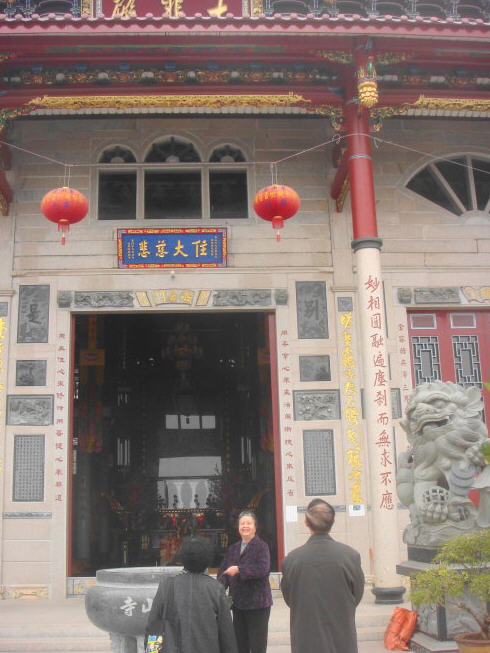 殿后有山路通山顶,草树葱郁,泥土清新,至半山台,俯观大悲殿全貎,远眺山脉游龙于半烟半雾半隐半现中,近有水田村居,远有楼群闹市,观睹之间,心胸顿然开阔。至山顶,还有东山塔可瞻,有万年石鼓可坐。