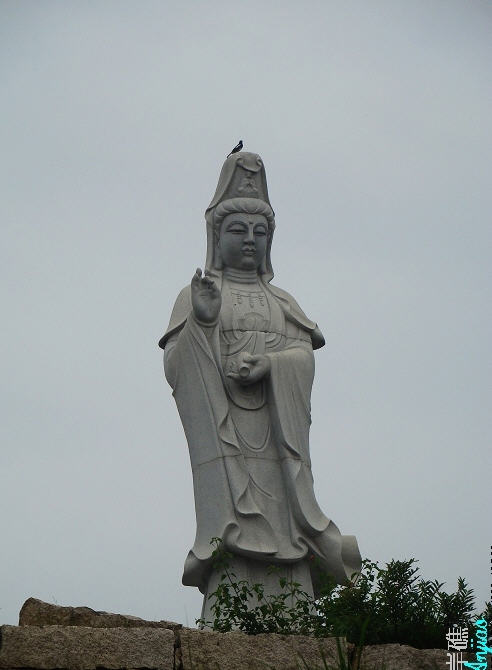 走进大殿,神龛上观音菩萨端坐莲台上,左手执着净瓶,右手作弹水状,丰润慈祥,目视下方,脸露笑容,两边对联道出观音菩萨的心境:“一片大悲心寻声救苦,无边福聚海绕益众生。”听梵音萦绕殿宇,一种虔诚之心油然而生。