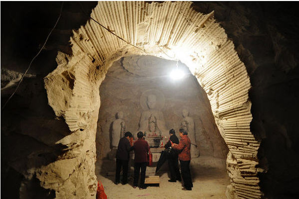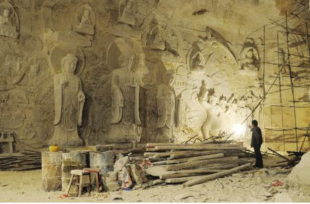 这个石窟正面石壁上,几百尊佛像已经完工,石壁上方还雕刻着两个类似飞天的造型,左侧石壁雕刻了佛像,旁边有供工人爬上爬下的脚手架,只是因为到了腊月,工人大都回家过年去了,脚手架上没有一个工人。