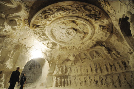 从一个不大的洞口步入石窟,没走几米,里面突然豁然开朗,一个面积数百平方米、高十几米的石窟出现在眼前,中间还有根大石柱。