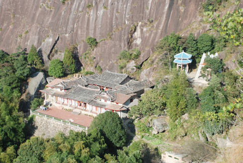 过诸洞,不远处就是背倚巨大石崖而建的麦斜寺。寺系八百多年前宋代自永禅师创建的,飞檐翼然,气势雄伟。数年前大加修葺,焕燃一新。寺的东北有条小径直通山巅,沿途怪石林立,或如莲花盛开,或如猴子抱瓜,或如观音坐地,或如龟蛇相会,惟妙惟肖,令人目不暇接。