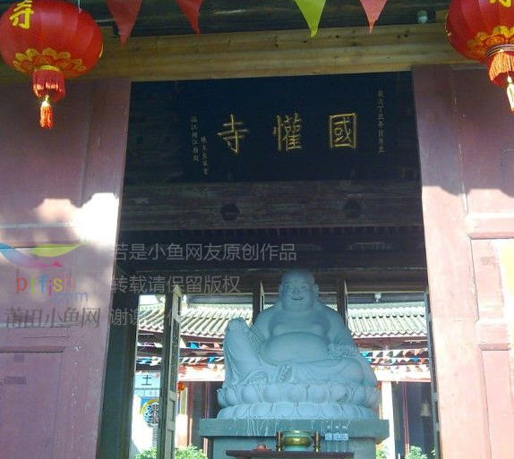 国欢寺,坐北朝南,占地面积4000平方米,规模宏伟,掩映在绿树花丛中,现存主要建筑物有山门、拜亭、大雄宝殿、法堂、两廊,大雄宝殿为重檐歇山式,抬梁结构,面阔五间,高大宏伟,虽已陈旧,,仍不失当年风姿。大殿内外石柱上,还雕刻有林森和邑人江春霖、张琴等名人的楹名。国欢寺是宗教圣地,又是融合人文景观和自然景观于一体的旅游胜地。