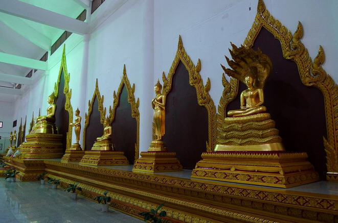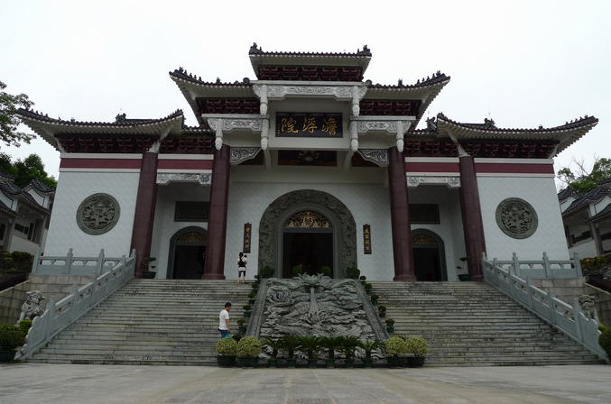 每层的正面以及大小门额上,都有或横或竖的门匾挂在中央,这些门匾大多出自中国名家之笔,如“淡浮院”三字为溥杰所题,“淡浮堂”是启功的手笔,刘海粟题写了“镇海楼”,还有赵朴初等人的题词。大厅里面高悬着“万寿厅”三个金色大字,正面墙上,一幅巨型千手观音的静态壁画,几乎占据了几十平方米的整个墙面。壁画左右分别挂着国王和王后的立姿玉照,侧前方放着中国文化部赠送的龙车凤辇,均为铜车实物。侧面墙上的巨型壁画左为“西天取经”,右为“八仙过海”。万寿厅是供奉至尊之圣的地方,两边各有金龙盘柱,龙首齐天,龙尾接地,金光耀眼,活灵活现,被称作“二龙护驾”。与万寿厅横向等齐的两侧墙上,左为泰国一至四世皇,右为五至八世皇。对面墙上有9条金色巨龙相互盘绕。因为泰国现为曼谷王朝第九世,这里雕着9条龙,这9条龙都面向万寿厅,故人称“九龙朝圣”。在9龙浮雕的左右两侧,有神态各异的十八罗汉雕塑。大厅内外陈列着很多展品,其中有相当部分是中国文化部专为淡浮院征集、制作的,总计为328件。这些赠品中有的是仿制品,有的是珍贵的文物。此外还有10位当代著名书画家专门为淡浮院而创作的书画真迹。这里陈列着完全仿照秦墓制作的秦兵马俑坑沙盘和中华民族最引以为骄傲的万里长城缩微沙盘。从1层到2层楼梯的墙壁上也满是壁画,楼梯口的两幅是神话故事中的“伏魔天”和“降妖天”,这两幅壁画均为台湾赠送。在2楼正中金色的大帐内,端坐着金面金身的道家鼻祖吕洞宾,左右有金龙卫护。左右两面的墙上是“水淹金山寺”和“八仙贺寿图”巨型壁画。门首的竖匾上写着“聚仙台”3个金字。