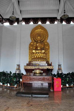 淡浮院的最高层第三层楼的佛台上,盘膝坐着释迦牟尼,金装遮体,佛光罩顶,神态安详。左侧一尊似人似兽的小塑像单膝而跪,服侍着佛祖,还有莲花、烛台、案头香炉等。淡浮院的2层是道家一统天下,3层则是佛家的世界,集佛教、道教于一寺就是淡浮院的显著特点。