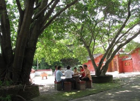 庵前门坪宽畅,更有新榕几棵,树下置有石桌石凳。我取出车载茶具,庵主送来开水,我等围坐石桌,饶有兴趣地泡起茶来。所泡兴宁黄蜂窝之单枞茶,其色橙黄,其香清纯,其味甘滑,冲泡十余次,茶色不减,众人唧唧称道。时值中午,庵前清静,微风吹拂,绿叶摇曳。我等端坐其中,临风把盏,品茶释怀,享其清静,何其乐哉!