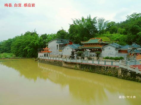 感应岩静处山谷流溪中,伫立感应岩正门,举目四望,可尽览全景:中有河流,左为主殿,右为甘露法雨台。河宽二十米,拦河筑坝,河面成湖,并作放生池。主殿为惭愧祖师菩萨,左右有楼阁相护,折入两门,方可登堂进殿。甘露法雨台为石彻半圆平台,台中立有滴水观音,台前辟有近亩花园,台后经南山礼佛台级二百段,可至山顶佛亭。