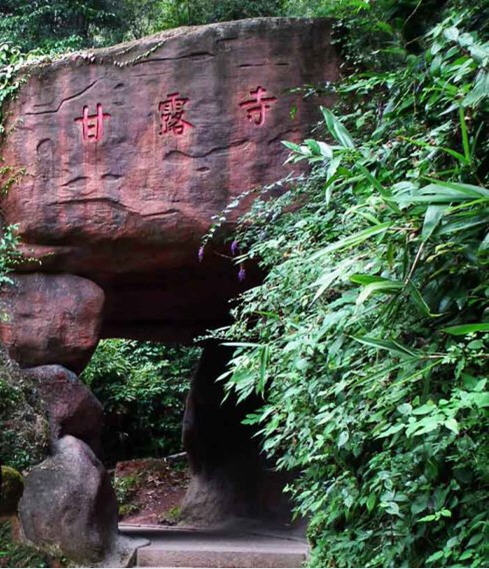 甘露寺的楼台殿宇,全都建在甘露岩寺内。甘露岩是隐藏在悬崖峭壁上的一个天然洞穴。这个洞穴很大最高处80多米 宽、深都是20多米。南宋绍兴16年(1147年),有一位云游的僧人看中了这个岩洞,变四处求人资助,筹划在岩中建寺。木匠们顺着各种地势,建造一柱撑地地独支楼阁的办法,把“杉木王”(高约30米,柱子的“胸围”3.38米),是甘露岩寺“一柱撑天”得建筑名扬四海。