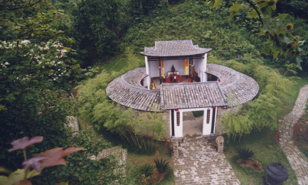 云峰寺坐落在半山腰,每当晨曦来临或雨过天晴时,祥云笼罩、若隐若现,犹如天外蓬莱,故取名为“云峰寺”。云峰寺始建于明万历四十年(即公元1612年),现在的建筑是按原样复建的。大家看云峰寺的建筑非常独特,和永定土楼一样都是圆形的建筑。它是根据天、地、人三才格局而创建的。云峰寺的圆形建筑模式和香林塔的椭圆形建筑模式正突出佛教的“圆”字(修炼圆满),也验证了寺庙一副对联:“上上有天天在上,圆圆像月月团圆”。
