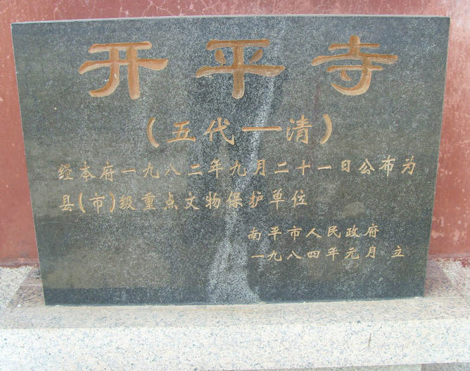 开平禅寺始建于五代梁开平四年(公元910年),原名报国显亲院,元改为寺,距今已有1093年的历史。相传南平法云庵高僧慧元带一只狗郊游,狗跑到现在开平寺的位置便不走了,日久变成石狗,慧元感到很惊奇,察看后觉得此处风景秀丽,是块风水宝地,便创建开平寺。