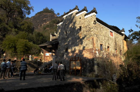 慧苑寺 在武夷山流香涧之畔,宋初建。朱熹曾在寺中住宿攻读,留下木匾"静我神",残匾尚存。寺庙随山势起伏,层层叠叠,具有典型的地方特色。有大雄宝殿、观音殿、藏经阁等建筑。寺后有大山、竹林,寺前有武夷山三十六峰之一的玉柱峰和流香涧,环境清幽。殿内抱柱的一幅对联写道:"客至莫嫌茶当酒,山居偏隅竹为邻。"这是武夷山最负盛名的对联之一,迄今仍为人们所喜爱。大殿外则是一幅"涧绕流香心洗涤,峰攀玉柱佛庄严"的对联,巧妙地把寺院前面的景观(流香涧、玉柱峰)嵌入联内,颇有韵味。玉柱峰的峰腰尚存石阶,从石阶尽处架梯可上峰顶,传说朱熹曾在峰顶居住。慧苑寺于2000年开始修复,2001年2月修竣开光。