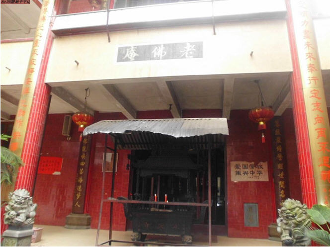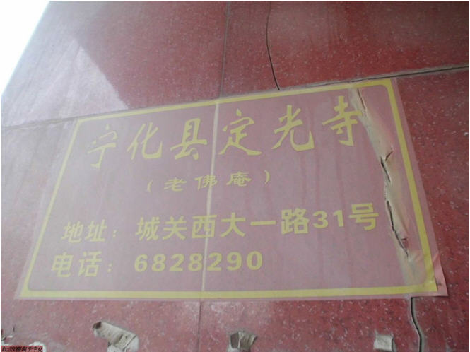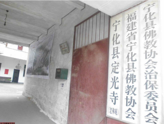 老佛庵原在城东二里许。现址坐落在小溪边,其四至界限为:东至小路石墈;西至宁石公路(现为佛教楼);南至张明珠宅、华西旅社;北至小街。占地面积为730m。该庵始建于唐乾符年间(874——879),原称崇福尼院,明改为崇福堂,清顺治戊戌(1658)年间,比丘自钦、广缘募捐重建,改名老佛庵,2002 年大殿落成后称定光寺。殿后有二泉井,传说为龙的二只眼睛,一井已废,一井仍在饮用。原庵为砖木结构,有大殿、观音堂、住房及配套设施,内有二个天井。原住寺人员有丘元华、元生、元东、释德琼等人。文革期间,大殿及附属建筑均被占用。仅德琼一人住观音堂下厅,坚守住庵50 余年。1985 年落实政策,归还寺庙房产,开始进行维修。按当时协商,庵的南面划出218 m建佛教楼,用作教会自养(另转让2 植给县工商联及生产队32 m店面一间)。该庵原占地面积480 m,房屋破烂不堪。1995年以释正平、德琼、照钦为首经县府批准改建。1996 年4 月动工,建4.5 层僧房,建筑面积约720 m,耗资20余万元,历时年余。后释正平另行他往。1998年释云慈来庵主持,与当地施主伊象淦等3 人组成筹建核心,率各方众信鼎力合作,得到当地及上海明鉴法师、福州会静法师大力支持。大殿与僧房共4 层主体完工后,装修资金无着,幸由释会清、释云慈前往广东多处募捐,喜得黄桂珍居士为首大量捐助。1998 年动工,历时5 年,至2002 年2 月峻工,建筑面积2200 m,耗资150 余万元。大殿有门楼、殿顶飞檐翘角,蔚为壮观。有“口”字形内院供奉弥勒。大雄宝殿一层为功德殿,供奉地藏菩萨、老佛(定光古佛)、二佛(伏虎禅师)、吉祥菩萨,还有五谷真仙。二层供奉三宝大佛、伽兰、韦驮。三层为藏经阁。大殿左边一楼为五观堂、厨房。二楼为观音堂,供奉观音菩萨,三楼为居士林活动场所,四楼为佛协会办公室。共有大小房间18 间,楼梯、走廊层层相连。整个建筑连为一体。内有现代化卫生设施,澡堂用具,千佛灯、梨木案桌、香橱、台湾大木鱼、大磬,还有铜钟和铜质长联,是一座具有相当规模的寺院,常年香火鼎盛。2004年,曾举行空前盛大的消灾祈福法会,有100 多僧人参加典礼。现有住寺人员12 人,县佛协会会长释云慈任住持。