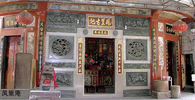 位于石狮北郊凤仪街与馆顶街交接处。始建于隋大业三年(607年),庵前雕有一对石狮子,供奉观音菩萨,取名“观音庵”。唐开元六年(718年),驿道(俗称“官路”)从观音庵前经过,为便于过往行人小憩,又在庵前建一石亭,称“观音亭”(也称“石狮亭”)。明洪武十五年(1382年),洪武帝敕封“观音庵”为“凤里庵”。民国22年,石狮成为经商集镇,为扩建街道,拆除凤里庵前的石亭及部分建筑物。翌年,颜姝娘、郭阿英前往菲律宾等地募资修葺.又在庵前建造排楼。