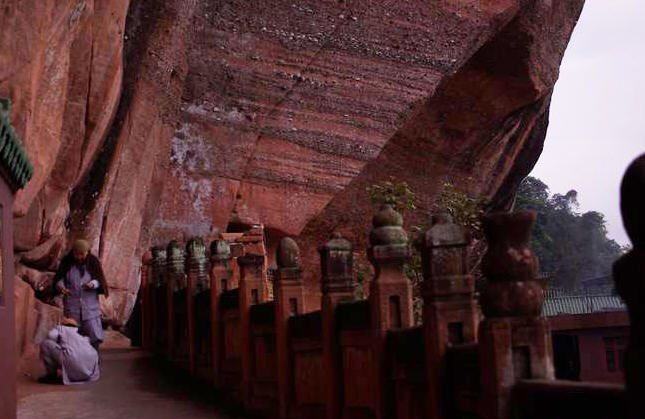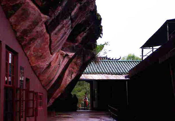 在茂密的林中,有条细长而弯曲的小道通向寺庙。此庙建立在悬崖的石窟里,脚下是陡峭的石壁。整座寺庙悬在崖上,形成奇妙的态势。寺庙内洁净如镜。一尘不染。充满安祥的氛围。尼姑们安祥的神态以及于世无争的眼神,拌随着袅袅神香,迷人的清香,更显寺庙的宁静和安祥。依栏杆远眺,著名的景峰尽收眼底,青山绿水好一派美色,更使人们流连忘返。在这山水天地间,拌合着宁静与安祥,怎不让人陶醉?