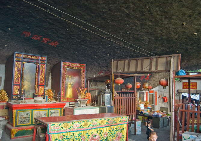 全定约600平方米,分为3个部分。刚进,石刻“万历四十八年(1620)潮州知府贾口口助银所修”。立有两大金刚像,旁有韦陀菩萨立像。过之,是大雄宝殿,主奉释迦牟尼佛,两旁十八罗汉金身。顶部石板,刻着青色的“威灵保障”四个大字楷书。下摆着一大香炉石床。再进之,有一尊在底层原石上雕刻而成巨大的弥勒佛坐像,非常惹人注目,它高2.55米,宽4.15米,右侧卧,右手倚着布袋,左手叠放在立起的左膝盖上,它可能凿造于南宋至元初,在中国石窟的大肚弥勒造像中年代较早,有很高的文物价值。大佛前置一大石香炉,刻“天古斗”三字。炉下石床右侧刻着“福生甘露地,寿齐玉简天”,左刻着“(明)万历丙辰年(1616)冬吉旦立”。
