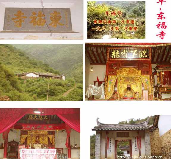 寺是清乾隆十一年丙寅(1746)皇恩特授度谍具戒比丘仁山僧化缘筹建,面积400多平方米。嘉庆十五年(1810)延法师开光安座,迄今尚遗留一幅用缎布写的《般若波罗蜜多心经》,属珍贵文物。寺中原有“圣旨诰命”金牌一块,惜已轶散。道光进士刘映华曾撰东井八景之一《禅林斜照》诗。民国时期,该寺曾多次拆毁。1982年春,善信集资重建,寺宇焕然一新。寺院坐东向西乙辛分金,是一长蛇形穴地。寺中盆栽奇葩异卉,清幽脱俗,从天井仰望斜子笄尖峰,俨然象一顶皇冠悬空高挂。寺内左廊是“陵烟阁”,有“男儿欲上陵烟阁,第一功名不爱钱”(朱熹诗句)的寓意,此乃清代士人读书之所。寺后有三座和尚与道人坟:一是乾隆丙寅年重建东福寺吉立的“皇恩特授度谍具戒比丘仁山禅师公之塔”,碑旁署三大房徒孙永祀;二是嘉庆二十三年戊寅(1818)立的“圆寂沙弥湛明皈善公神位”;三是民国癸亥年(1923)立的“张一贯道人之墓”,墓碑均完善无损。寺门前有一块巨大“蚧子石”,惟妙惟肖地蹲立着。古寺周围还有“仙人石”“饭饮石”等胜迹,流传着一个个的故事。