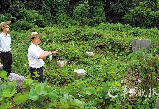 15日,羊城晚报记者来到距韶关市区约60余公里的东坪水库。沿一羊肠小道徒步而上至海拔700多米处,出现一片宽阔的平地,但见断墙残垣、石柱门槛、断碣残碑散落。大多数石碑上的文字风化严重,但仍可辨认“明崇祯十年、清康熙二年、康熙二十六年”的字样。