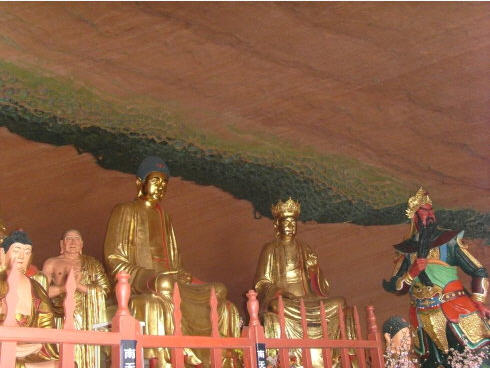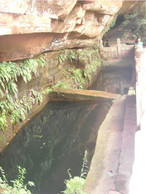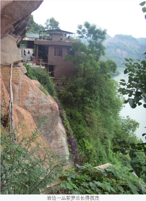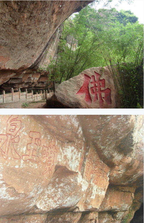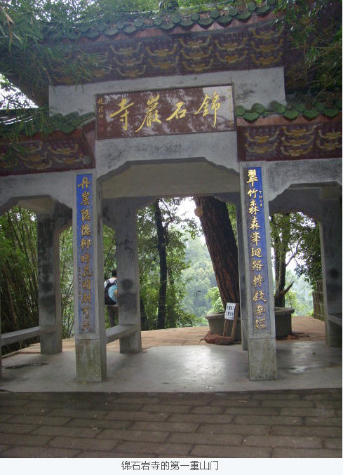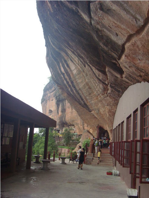 韶关市仁化县的丹霞山风景区分为上、中、下3层以及锦江风景区。从丹霞山山麓入口沿陡峭的石阶蜿蜒而上,至半山亭时有一石径向左而折,沿此路向左转入,即达丹霞山之下层风景区。丹霞山下层风景区以锦石岩为中心。锦石岩因石壁五色间错、四时不同而得名。锦石岩寺就“悬挂”于临江的百丈峭壁之上,面积有2000多平方米。这座石窟寺规模虽然不大,但它却是丹霞山最为古老的佛教寺庵。远在隋唐时,这里已有僧尼参修佛法。至明成化年间,此处僧人遍植松杉,并建构起伽蓝堂廊房和(尼姑)寺庵。