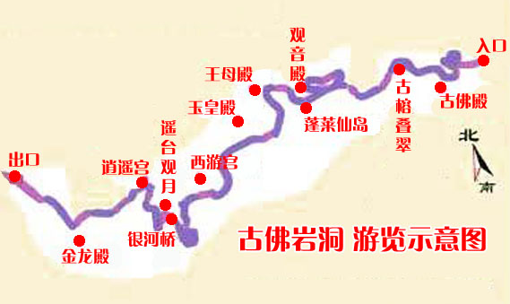 古佛岩属大型石灰岩溶洞,洞内上下重叠三层,最高处达30米,总面积12000多平方米,常年气温保持在19~20摄氏度。岩洞内的景区主要分为古佛殿、观音殿、王母殿、玉皇宫、西游宫、逍遥宫和金龙殿等七个宫殿,整个流程570米。各式石笋、石花、石柱、石幔,或插其中,或悬其上,色彩斑谰,景象纷呈,蔚为奇观。最妙处是许多钟乳石,其状如仙人佛众,形神各异,一经点化,呼之欲出。古佛岩还有三亿年前的海底珊瑚化石和罕见的大型石脑,难得一见,亦堪称一绝。