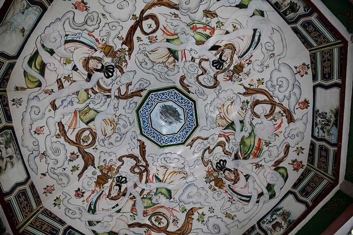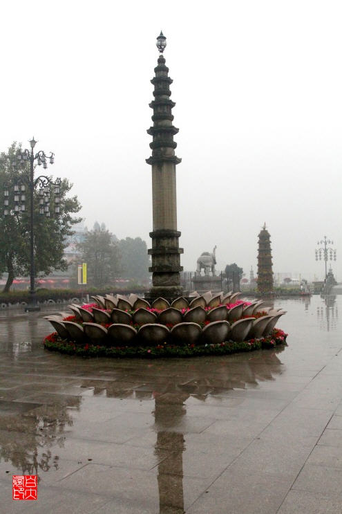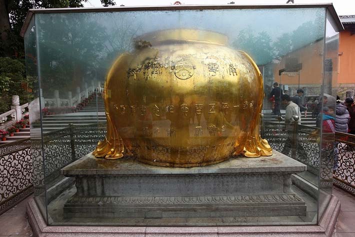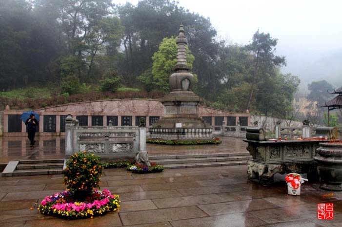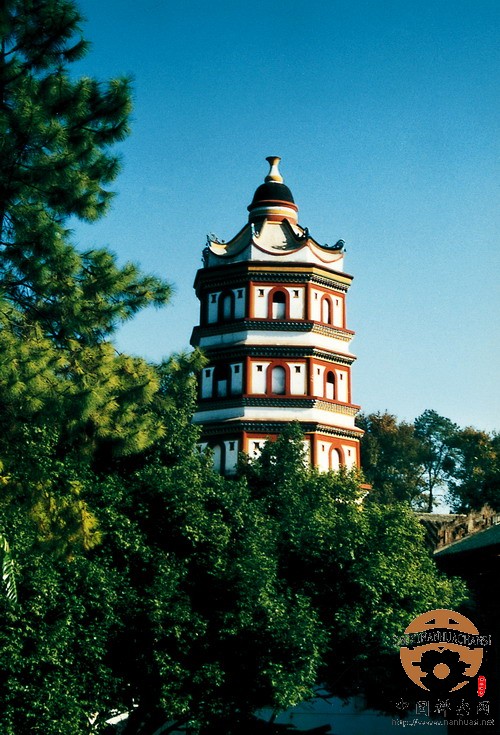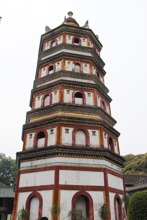 灵照塔为楼阁式八角五层涩檐出平座砖塔。塔高29.6米,底径11米。塔顶用生铁铸成“堵婆”式,铜铸宝瓶塔刹。初建于唐先天年间(公元712~713年),唐元和七年(公元812年)宪宗赐额曰“元和灵照之塔”。初建时为木塔,多次焚毁重建,至明成化年间(1465~1487)始改为砖塔。今仍保持明代原貌,为南华寺最古、最高的建筑。祖殿中央三座仿阿育王式木塔佛龛分别供奉着三具肉体真身菩萨,左为明代丹田和尚真身,右为明代憨山德清和尚真身,居中者则为禅宗六祖慧能和尚真身。