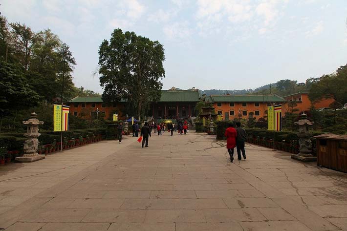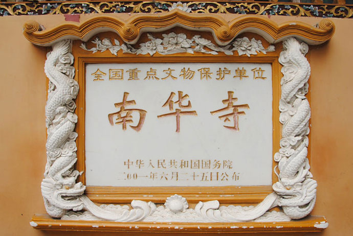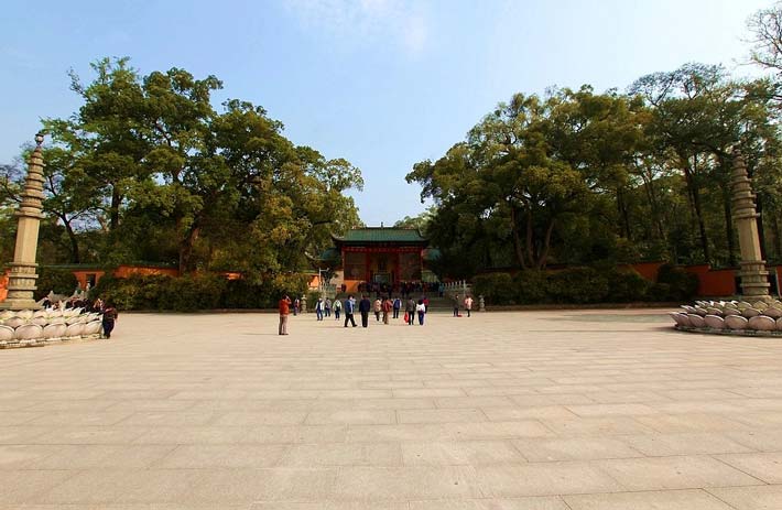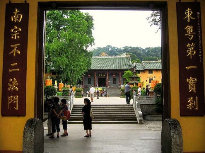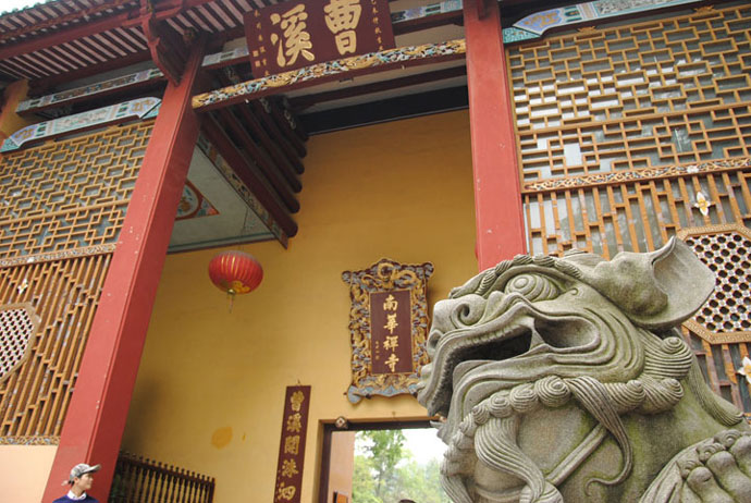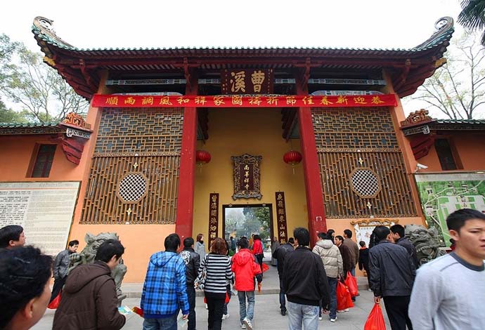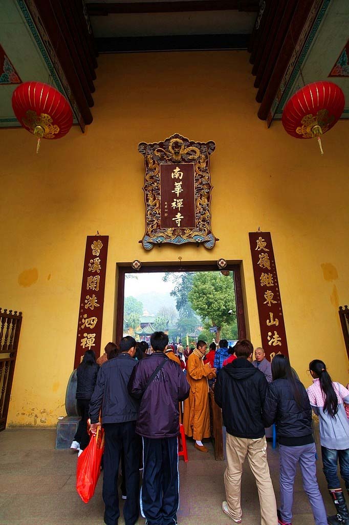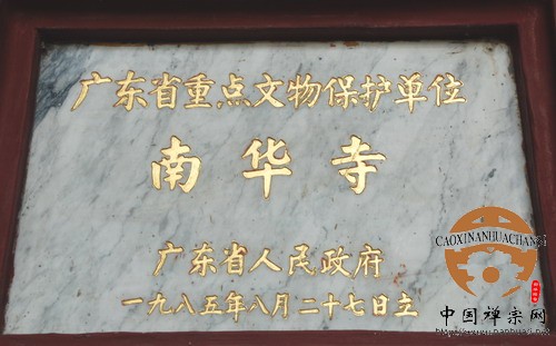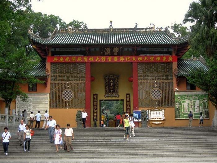 南华禅寺位于韶关市曲江区马坝镇以东7公里曹溪河畔。据明万历《曹溪通志》记载:南朝梁武帝天监元年(公元502年),印度高僧智药三藏见此地“山水回合,峰峦奇秀,叹如西天宝林山也”,遂建议地方官奏请武帝建寺。天监三年(公元504年),寺庙建成,梁武帝赐额“宝林寺”。唐仪凤二年(公元677年)始,中国佛教禅宗六祖惠能大师来宝林寺说法37载,使南宗禅法大播于天下。故南华寺素有南禅祖庭之称,还与嵩山少林寺并称为禅宗祖庭,在东南亚、朝鲜、韩国、日本以及欧美等国家和地区有重要影响。武则天万岁通天元年(公元696年),武则天赐慧能水晶钵盂、磨衲袈裟等物。唐神龙元年(公元705年),中宗又赐宝钵、磨衲袈裟等物,并将寺名赐改为“中兴寺”;神龙三年(公元707年)再改“法泉寺”。宋开宝元年(968),太祖赐额改称“南华禅寺”,沿称至今。1983年,南华寺被确定为全国重点寺庙。今南华寺占地总面积约一千多亩,主体建筑群总面积3万多平方米。为阶梯式中轴线对称平面布局。寺向为坐北朝南。中轴线上由南至北依次为曹溪门、放生池(五香亭)、宝林门、天王殿、大雄宝殿、藏经阁、灵照塔、六祖殿、方丈室。东侧依次为钟楼、客堂、伽蓝殿、斋堂等;西侧依次为鼓楼、祖师殿、功德堂(亦称西归堂)、禅堂等。主体建筑院落外,北侧有卓锡泉(俗名九龙泉)、伏虎亭、飞锡桥;西侧有无尽庵、海会塔、虚云和尚舍利塔;东侧有中山亭、息心园、多宝阁、佛学院、禅堂。目前建设唐代大南华正在进展中。