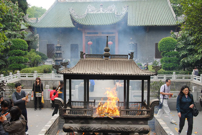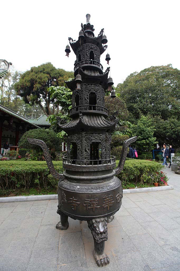 全寺殿堂飞檐斗拱,以重檐歇山顶、一斗三升居多。青砖灰沙砌墙,琉璃碧瓦为面,灰脊、琉璃珠脊刹、蔓草式脊吻。重要殿堂脊吻与脊刹间置琉璃鳌鱼,正脊两端饰夔龙脊头。多用木圆柱为支柱并将殿堂分为多间,石柱础多覆盆式。门窗则多花格门、格子窗棂。主要殿堂和钟鼓楼的大木梁都是用巨大铁力木(坤甸木)架成(为清初平南王尚可喜重修南华寺时所用之木)。大雄宝殿高16.7米、宽34.2米(七间)、进深28.5米(七间)。重檐歇山顶,前后乳袱用七柱、二十六檩,柱头铺作为六铺作,三抄,无昂,偷心座,补间铺作用二朵。琉璃碧瓦,灰脊,蔓草脊吻,琉璃珠脊刹。格子窗棂,前后均花格门。是广东省最大的寺庙建筑。三宝大佛塑于大雄宝殿正中屏墙神龛之上,连座均8.31米,全身遍贴金箔。观音菩萨泥塑立于三宝佛后屏墙,身高4米,遍贴金箔,跣足立于鳌头,左手倒持净瓶,右手轻执柳枝。五百罗汉泥塑群分塑大雄宝殿四壁及后屏墙,每尊身高约1.1米,与名山大海浑为一体,气势磅礴。弥勒佛塑像坐于天王殿正中屏墙神龛之上,体宽肚凸,笑口常开,憨态可掬。四大天王塑像两两分立天王殿东西两厢,手持法器,面目狰狞。