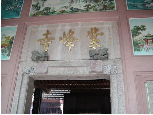 紫峰寺匾额“紫峰古寺”是释慧原法师所书,字体浑朴大方。大门有刘锦辉撰作的“紫峰”冠首联:“紫岭烟霞万象奇秀,峰山云海四时葱茏。”两边门壁上有淑宜子以“紫峰”题撰的鹤顶格联:“紫阁法宇宏開,梵经万诵,亿万众生沾福佑;峰山慈云永护,钟鼓千声,大千世界证菩提。”第二大门上匾额“紫峰寺”,为释智诚长老所书。正门两侧有二旁门。旁门匾额为“祗园”、“鹫岭”。“祗园”、“鹫岭”是释迦牟尼佛居住和传教圣地,用在这里,意即此处乃丛林净土。